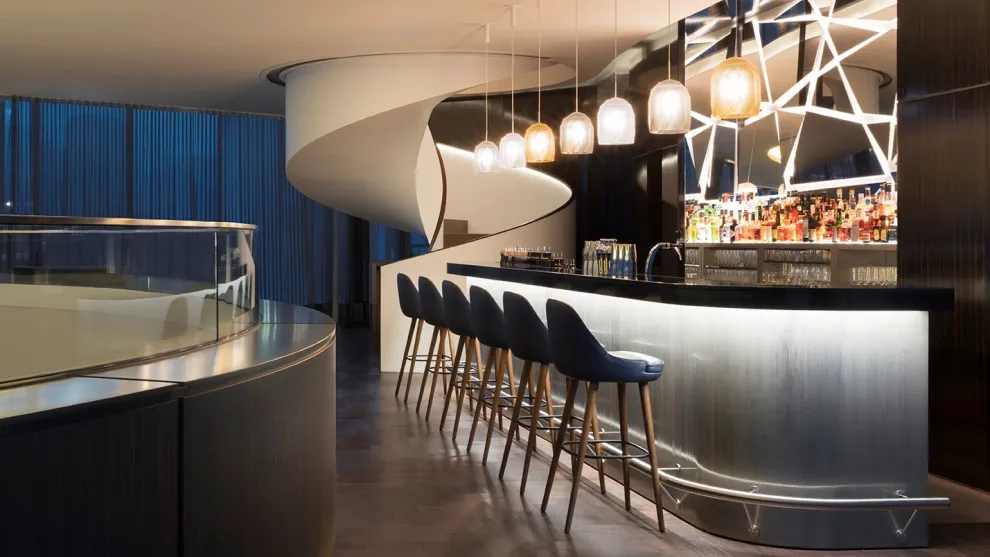 Die Grundform des Hotels besteht aus drei Kreisen, die durch ihre Überlappung auch den Innenraum bestimmen. Zwei Höfe – ein gedecktes Atrium und ein offener Innenhof – lassen die Grenzen zwischen „Innen“ und „Außen“ verschmelzen. Die 131 Zimmer und Suiten sowie 17 Residenzen befinden sich in den ersten fünf Stockwerken. Die 6. Etage ist dem Spa vorbehalten und über allem, in der obersten Etage, hält ein Gourmet-Restaurant Einzug. Hier genießt der Gast Sterneküche mit Traumblick auf die Alster.