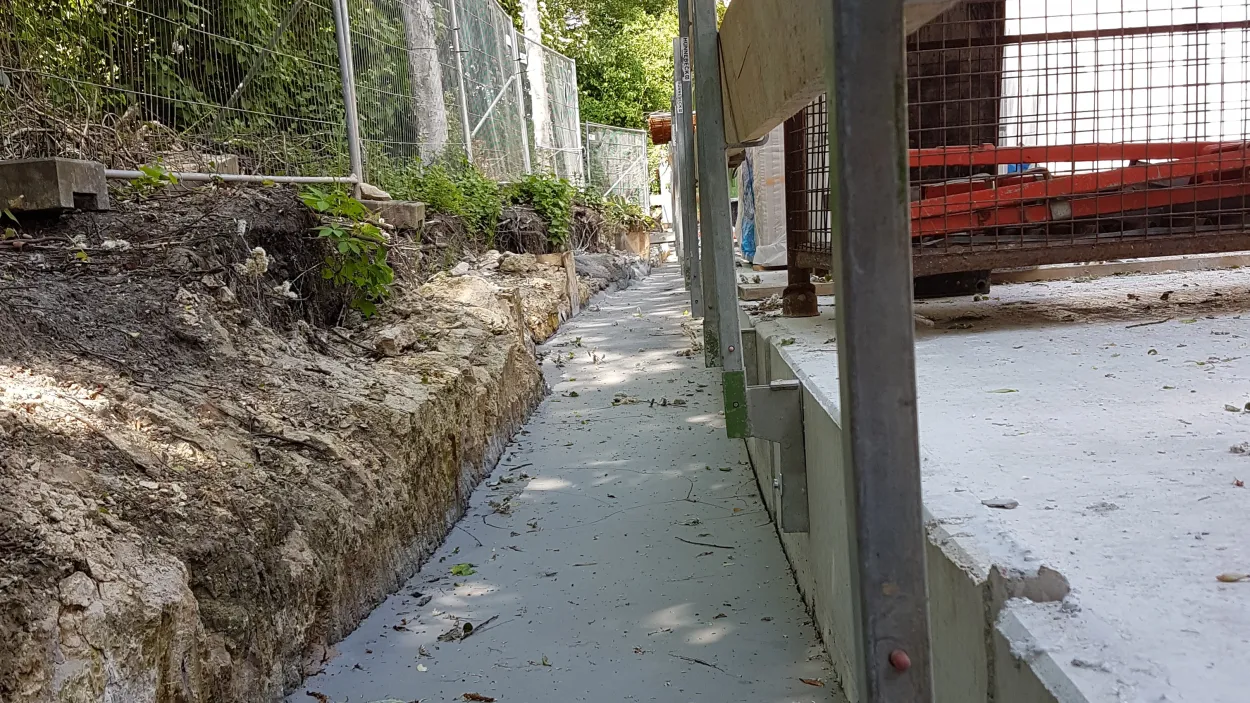 Holcim Terrapact zeigt, dass Flüssigboden eine gute Alternative zu klassischen Verfüllbaustoffen darstellt. Holcim Terrapact ist selbstverdichtend, d.h. es sind im Gegensatz zum Sandeinbau keine großen und nicht zuletzt lauten Gerätschaften notwendig, um den Boden zu verdichten. Der Spezialbaustoff wurde in einer Betonmischanlage aus Holcim Multicompound (Spezialbindemittel), Sand, Zement und Wasser hergestellt und im Mai 2018 mit Betonfahrmischern zur Baustelle transportiert. Der Einbau erfolgte mittels einer Betonpumpe über Schläuche mit einer Länge von ca. 200 Metern. Nach nur etwa vier Stunden war die gesamte Menge geliefert und eingebaut (ca. 150 Kubikmeter bzw. 300 Tonnen). Bereits am nächsten Tag war der Boden so fest, dass man ein Gerüst sicher aufstellen konnte. Wenn das Produkt seine Endfestigkeit erreicht, lässt es sich bei Bedarf (z.B. für neue Leitungen) problemlos mit einem Minibagger lösen.