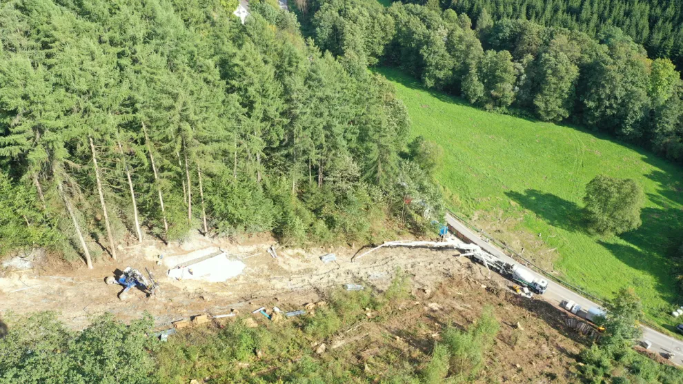 Die Gasleitung im Sauerland stellte eine akute Gefahr dar: Der Hauptversorgungsstrang für Lüdenscheid arbeitet mit 70 bar Druck und musste nach dem Hangrutsch auf eine Notversorgung heruntergeregelt werden. Eine klassische Stabilisierung mit Spritzbeton war ausgeschlossen, und die alternative Sandverfüllung hätte enorme Kosten und hohen logistischen Aufwand verursacht. Besonders problematisch war die steile Hanglage mit bis zu 25 % Gefälle und die schwer zugängliche Baugrube. Der Zeitdruck war groß, da die Leitung schnellstmöglich gesichert werden musste.